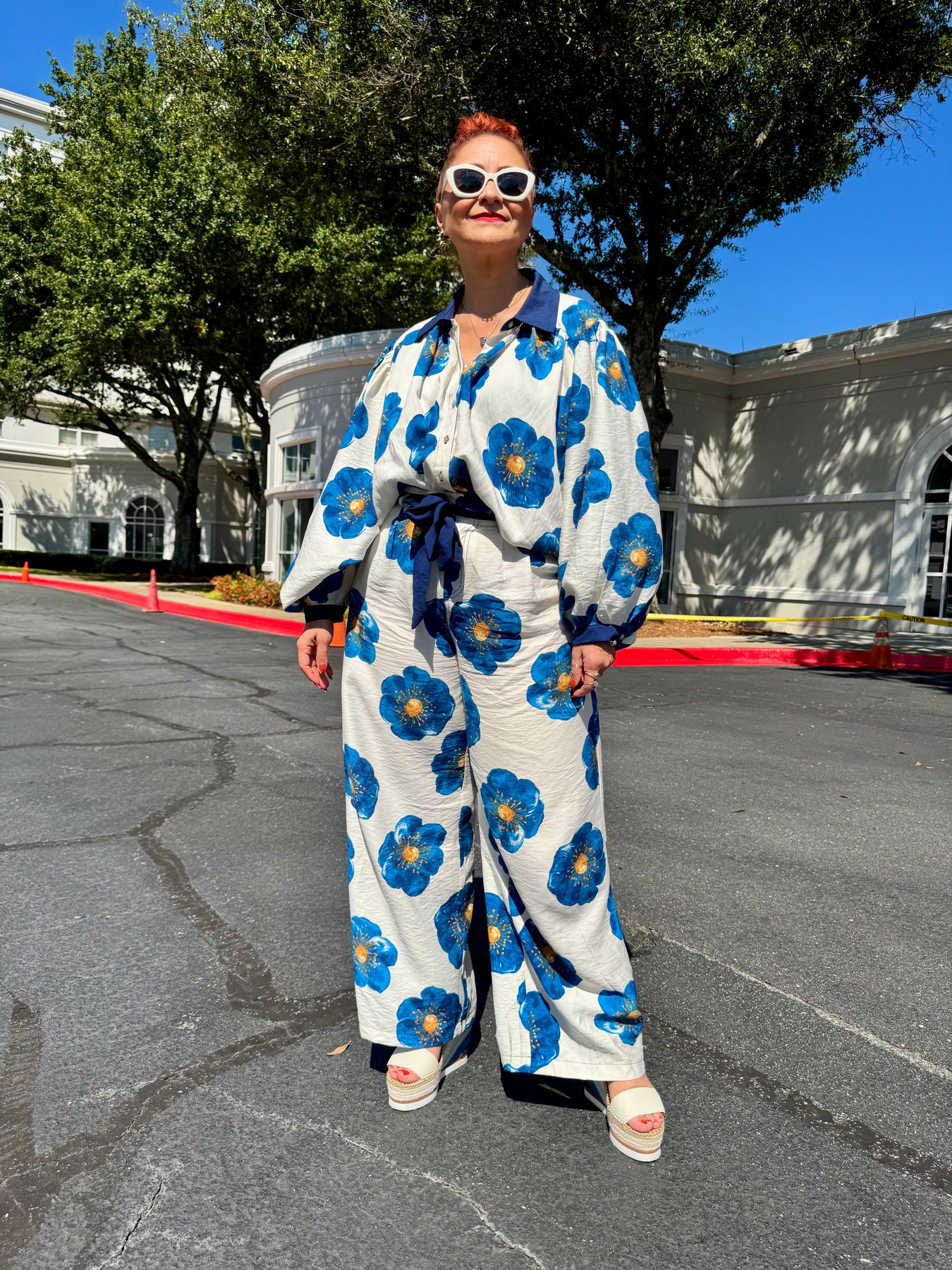 Bloom boldly in this flowy statement top featuring vibrant blue florals on soft ivory fabric. Designed with a relaxed fit and billowy sleeves for effortless elegance, it’s your time to flourish in style.